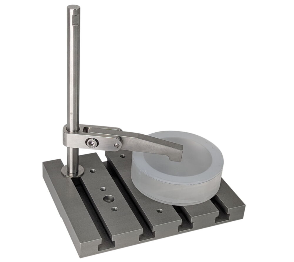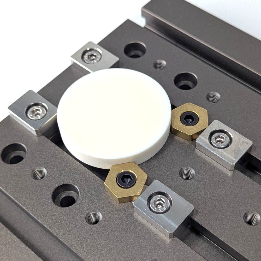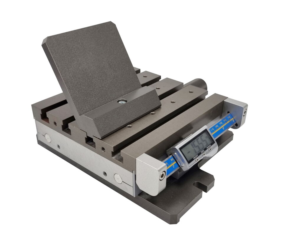 Auf dem Nutentisch der DWS.375E lassen sich Ihre Werkstücke mit unseren angebotenen Spannmittel flexibel befestigen, siehe Zubehör unten.